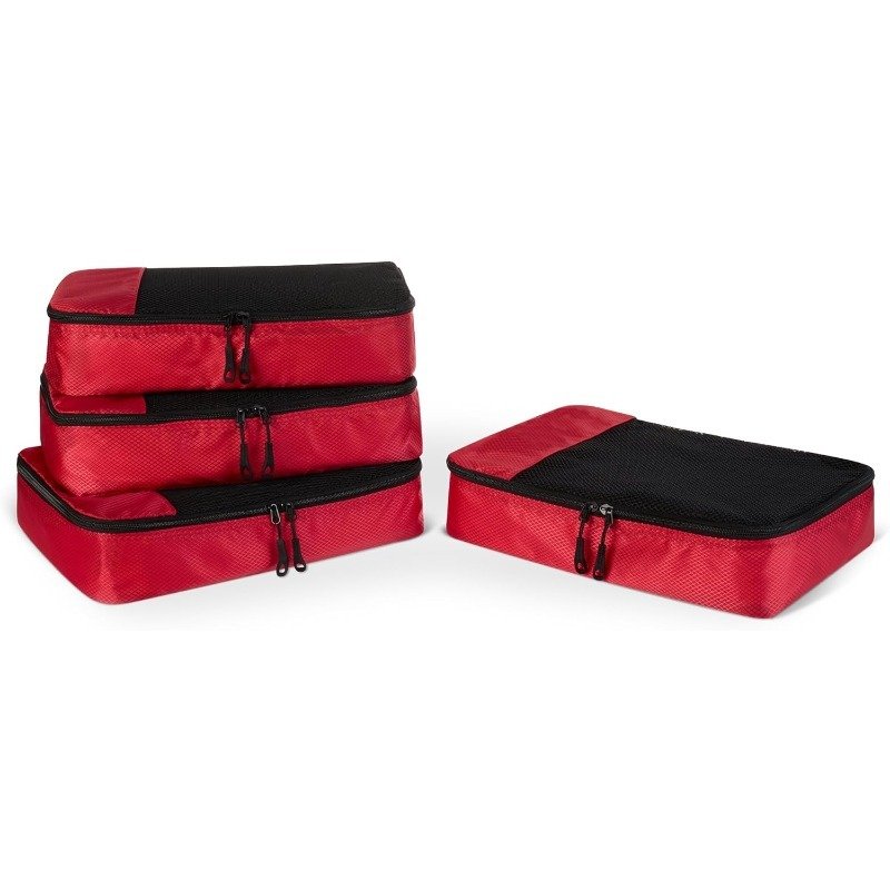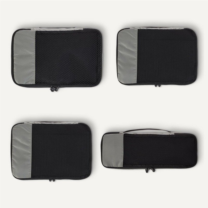 Zestaw 4 kostek do pakowania (mała, średnia, duża i smukła) z siatkowymi klapami pozwalającymi zajrzeć do środka. Wykonane w 100% z poliestru, z podwójnymi zamkami, przeznaczone do porządkowania ubrań i akcesoriów w bagażu.